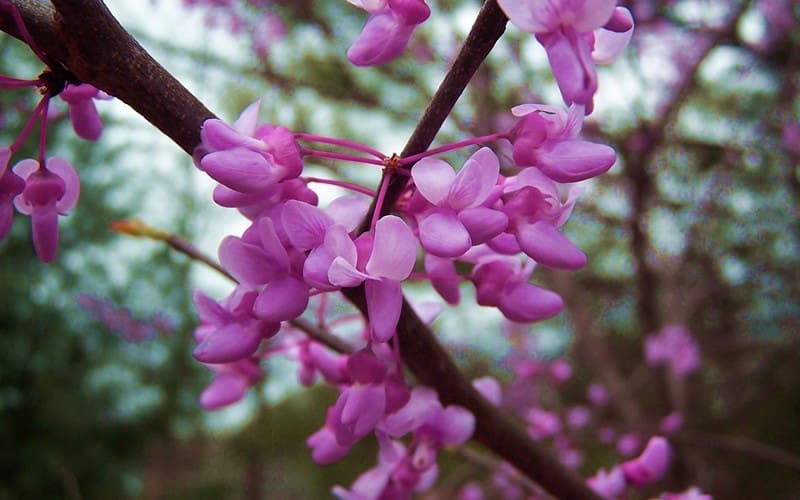 Redbuds bloom red or vibrant deep pink in early spring. Then, they fill out with large heart-shaped leaves that are about the size of your hand. You can get single stem or multi-stem varieties that reach 20 or 30 feet at maturity. The blossoms attract honeybees and the seeds attract songbirds.