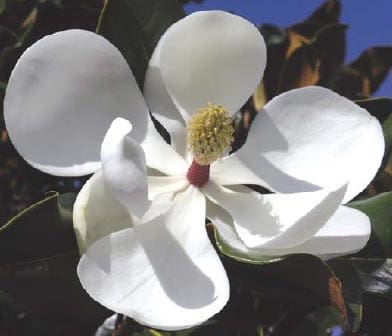 Southern Magnolia is an evergreen with large waxy leaves. It blooms in mid summer (June-July). This is a large tree that can reach 40 or even 60 feet at maturity. It is also a versatile tree. It enjoys full sun but can also tolerate a moist environment.