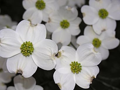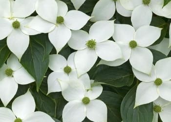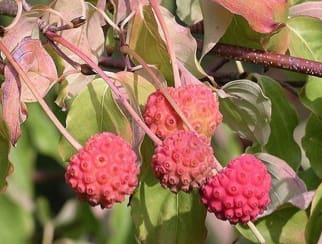 Cornus Kousa. We also like this import (China). Although it blooms later than Cornus Florida, the Kousa has an exfoliating bark that provides visual interest year round—especially in winter. Night lighting brings out the texture and contrasting tones in the bark. Of special note: The Kousa is more resistant to borers and other insect invaders. So, if the birds in your area are too well fed to keep the insects in check, the Kousa dogwood might be a better choice.