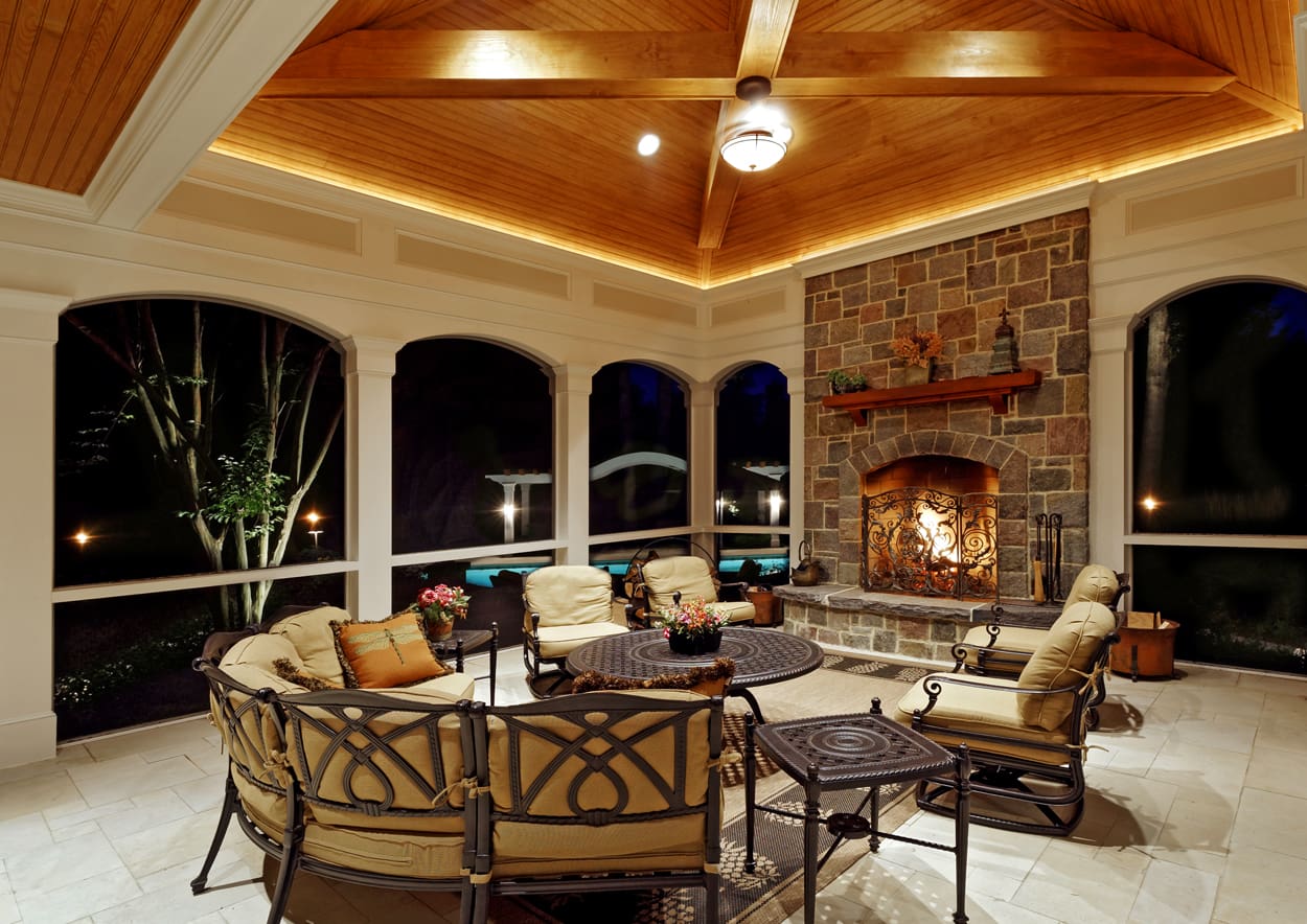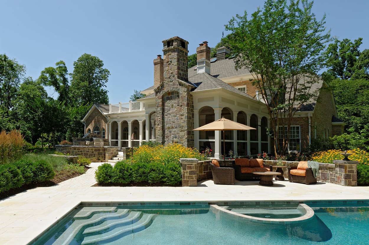 The porch sits on a raised terrace that steps easily out to the grill area, then on to the pool deck. The chimney is a major focal point on the porch structure and plays well from different viewpoints around the yard. It was so integral to the design that the fireplace, chimney and all the stonework was completed before carpenters began building the porch.