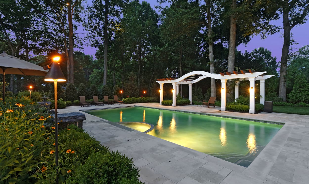 On the side of the pool opposite the lounge area, a poorly constructed (and rather lackluster) pergola was replaced by a new airy, graceful design that arcs over a poolside dining area