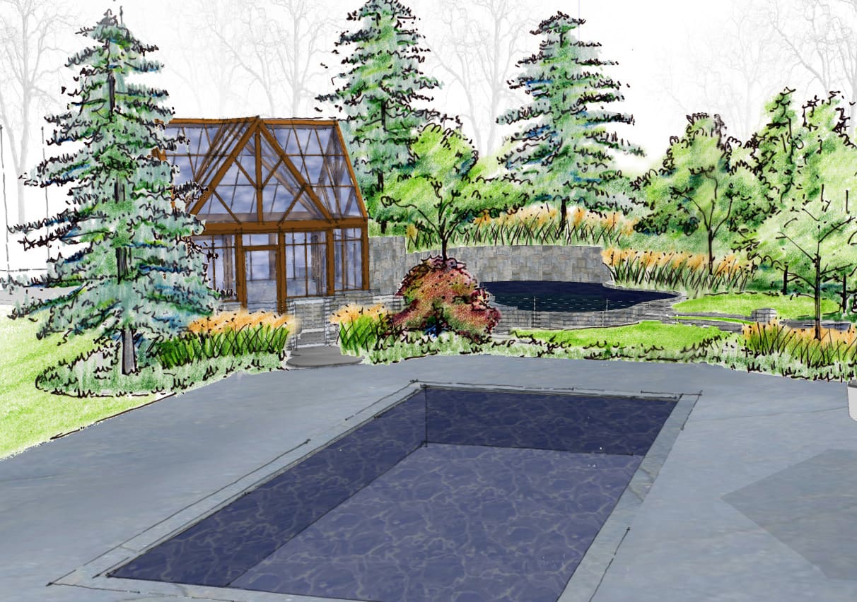 The minimalist aesthetic requirements of this Oakton Virginia landscape design, which included a greenhouse, “weeping wall” and koi pond, presented complex technical challenges. The assignment was to determine how these visually powerful features should interact with each other and where best to site them in the landscape. The greenhouse design drove the creative process.